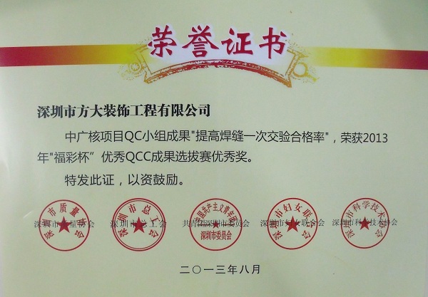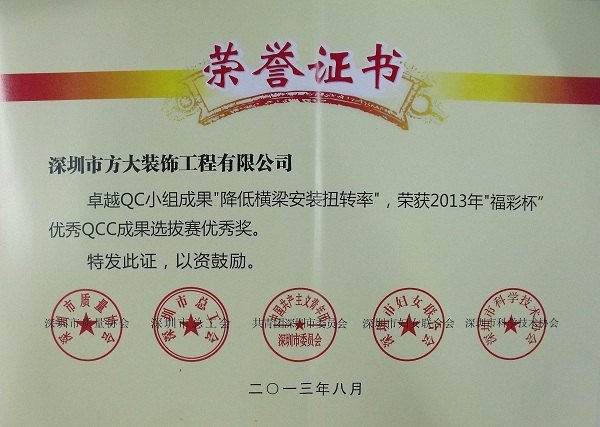 荣获深圳市2013年“福彩杯”QCC成果选拔赛优秀奖