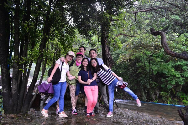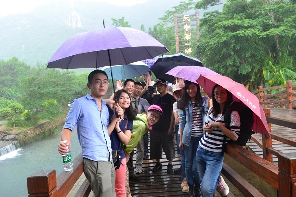 活动当天一早就开始下起了大雨,大家冒雨在公司集合,乘大巴向白水寨出发,这场大雨也意味着此次活动将是一次特别的生日经历。大家一路欢声笑语抵达了白水寨景区。白水寨果然名不虚传,瀑布从山顶喷薄而落,不禁让人想到李白 “飞流直下三千尺,疑是银河落九天”的名句,景区内可谓“五步一小景,十步一大景”,各种景色让大家目不暇接,当大家走在素有“天南第一梯”的9999级的登山步径上,可以在木阶之间清晰看到脚下流淌的湍急水流,刺激惊险。