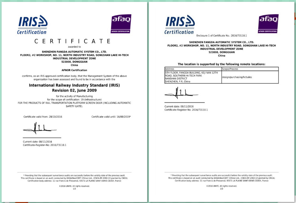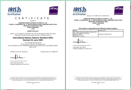 深圳市sunbet申搏自动化系统有限公司作为全球最大的轨道交通屏蔽门系统供应商,导入IRIS经营管理体系是公司与世界先进管理方法接轨的必要举措。IRIS管理体系认证证书的获得,是独立的第三方机构对sunbet申搏自动化公司的管理体系符合国际铁路行业统一规范标准的认可。通过IRIS经营管理体系认证,意味着sunbet申搏自动化公司的管理体系接轨世界先进管理方法,在ISO9000基础上进一步提升企业的整体管理水平。在取得IRIS管理体系认证证书后,sunbet申搏自动化公司的相关认证信息将由IRIS管理中心录入IRIS门户网站认证信息库进行统一管理,同时可供全球铁路行业客户进行检索、浏览,这为sunbet申搏自动化公司拓展市场领域、获取更多的国际订单提供了强有力的保障。