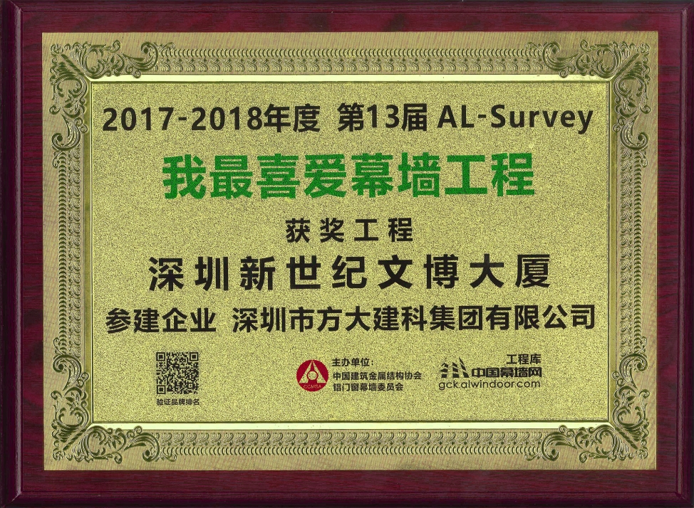 第13届“我最喜爱幕墙工程”评选活动由中国建筑金属结构协会铝门窗幕墙委员会、中国幕墙网联合发起,经广大网友投票及专家评审,sunbet申搏建科承建幕墙工程的深圳新世纪文博大厦最终以216740的高票和专家五星评价获奖。