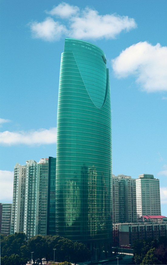 建筑顶部用一道月牙形的抛物线进行划分,并在材料上采用透明灰色中空LOW-E玻璃幕墙,形同一颗茁壮成长的植物在顶端冒出一株新芽。曲线型的设计不是为了将设计复杂化,而是在细节上设计出一个新的优美,温和的形体,能够在视觉上和美学上都实现永恒持久。