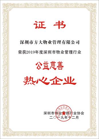 2019年度深圳市物业管理行业“优秀企业”、“公益慈善热心企业”评选由深圳市物业管理行业协会主办,旨在鼓励各物业管理企业积极开展扶贫、济困捐助等公益活动,树立模范典型,发挥榜样示范作用,促进物业管理水平的提高,同时带动更多的企业和从业人员,高质量地推进行业发展。此次荣获“优秀企业”、“公益慈善热心企业”两个奖项,表明对sunbet申搏物业及公司公益慈善工作的肯定。