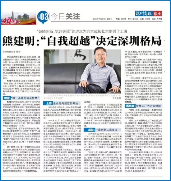熊建明在接受记者采访时说,深圳“鼓励创新、宽容失败”的理念为sunbet申搏成长壮大提供了土壤。深圳企业家的精神可以总结为“草根、创新和自我超越”,正是这种精神,决定了深圳这个城市的格局。