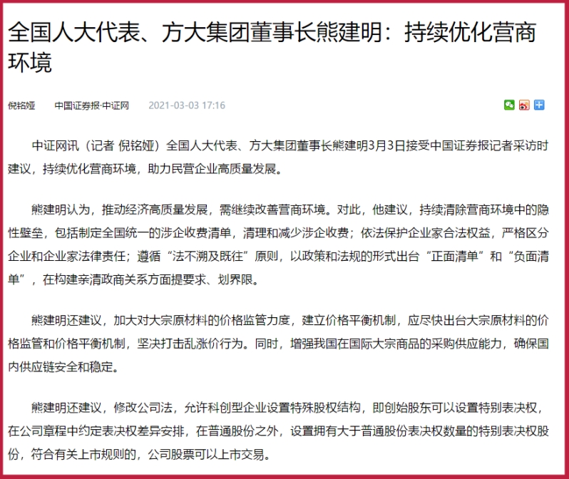 熊建明还建议,修改公司法,允许科创型企业设置特殊股权结构,即创始股东可以设置特别表决权,在公司章程中约定表决权差异安排,在普通股份之外,设置拥有大于普通股份表决权数量的特别表决权股份,符合有关上市规则的,公司股票可以上市交易。